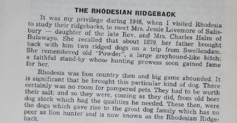 Boken THE RHODESIAN RIDGEBACK, The Origin, History and Standard, av T.C Hawley från 1950-talet återger händelser och hundarnas beteende från det tidiga 1900-talets lejonjakter. Tillsammans med ett par eller fler Rhodesian Ridgebacks möter jägarna lejon öga mot öga, det ger erfarenheter vidare än dagens akademiska beskrivningar från rastgården i parken.