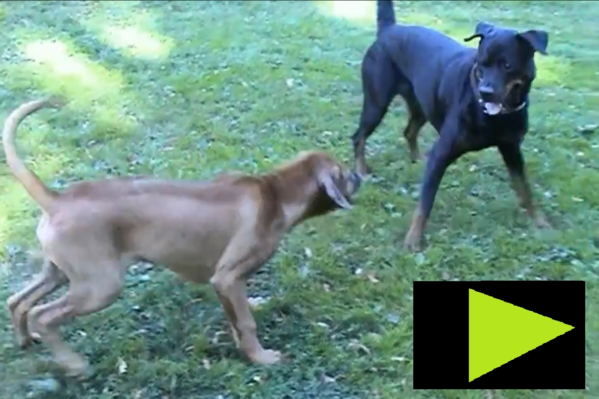 Ovan bild visar hur en inledingsvis dominat Kungspudel utan förmåga att avläsa signaler rusat mot mina hundar, för att sedan i panik vända när Texas deklarerar sin kraftfulla dominans. Vid ömsesidig respekt inför respektive hanhunds signaler för utrymme och avstånd hade en liknande situation inte utvecklats. Ofta misstolkas detta till RR:s nackdel då den upplevs som skrämmande enbart genom sin styrka. Uppvisas lekfullt och naturligt i ovan video 4.