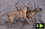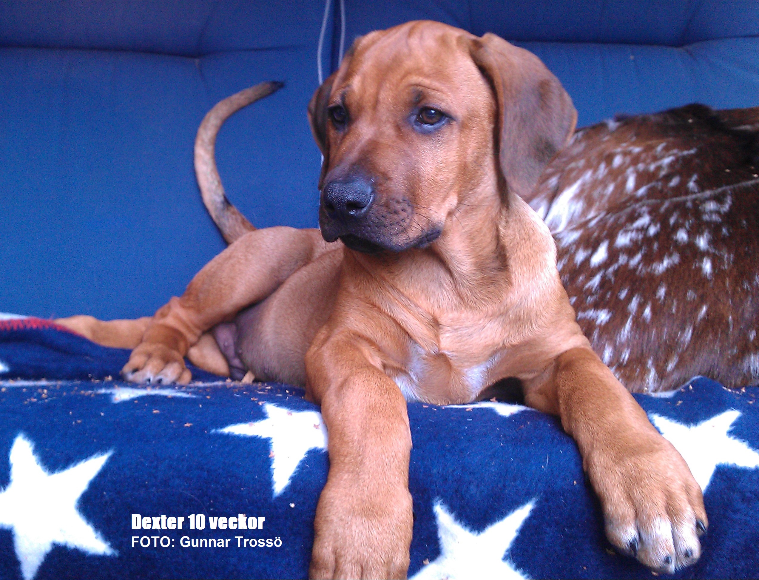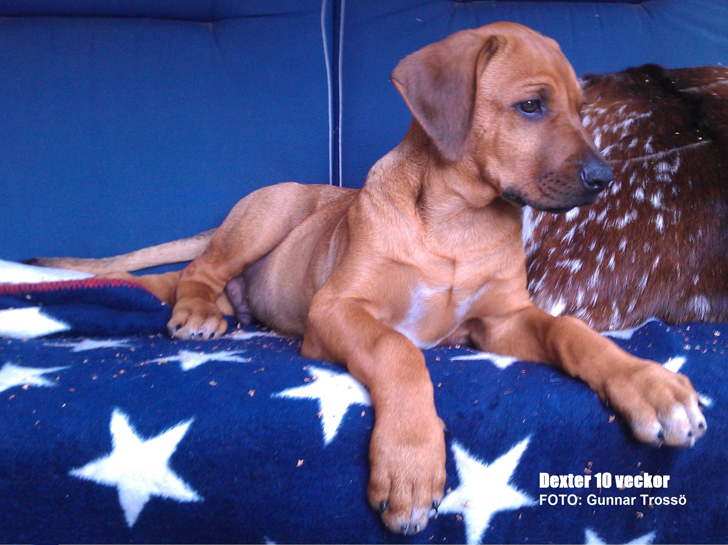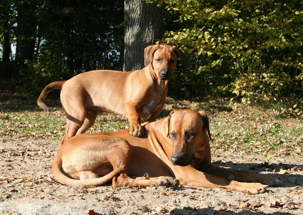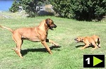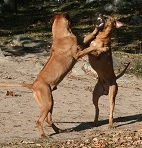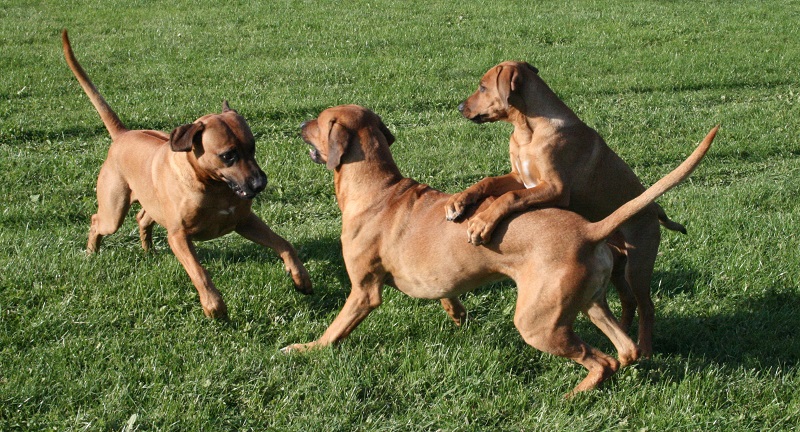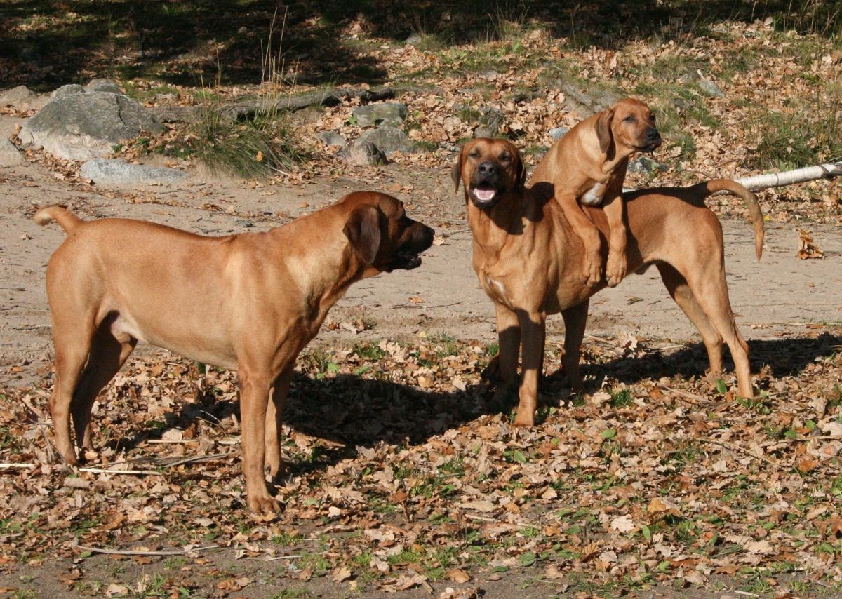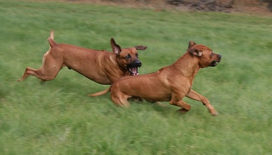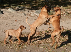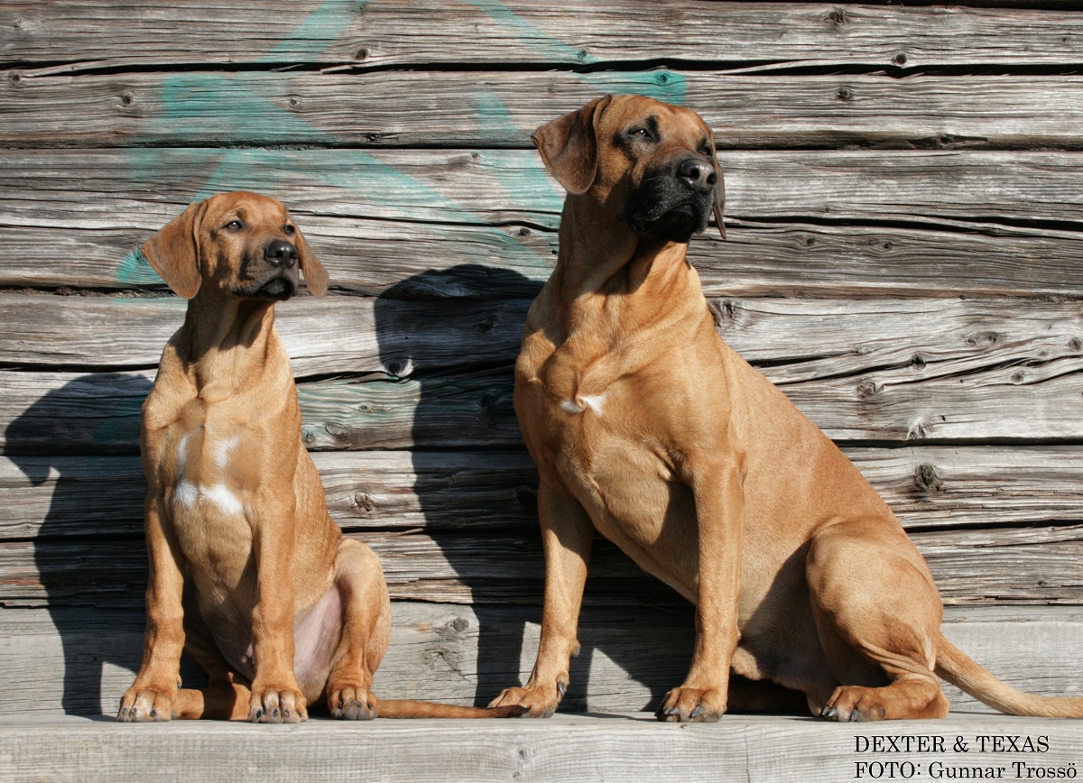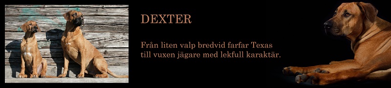Den aktiva leken som stundtals ser mycket hård och tuff ut skapar nära band och stark tillit mellan hundarna. Genom ett stort fötroende för varandra tillåts växelvis nedläggning och anfall utan att rangordning eller prestige rubbas. Ett naturligt avstämt samspel mellan fysiskt och mentalt starka hundar. Rhodesian Ridgeback är inte spänd och nervös till sin natur. Dess inre och yttre styrka formar dess stabilitet och trygga framtoning. Dexter söker lite uppmärksamhet och lägger tassen på pappa Dallas.