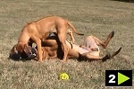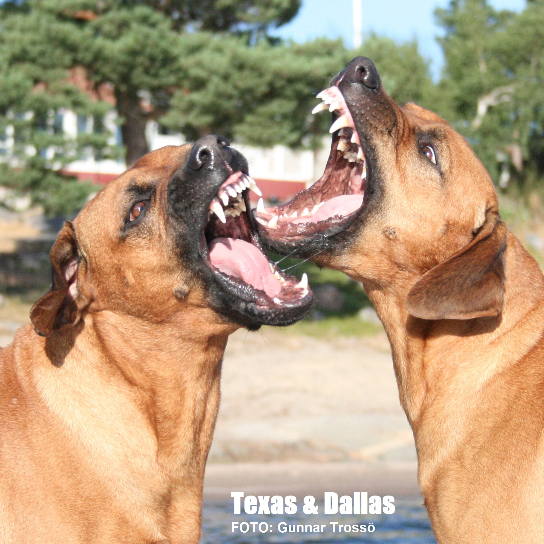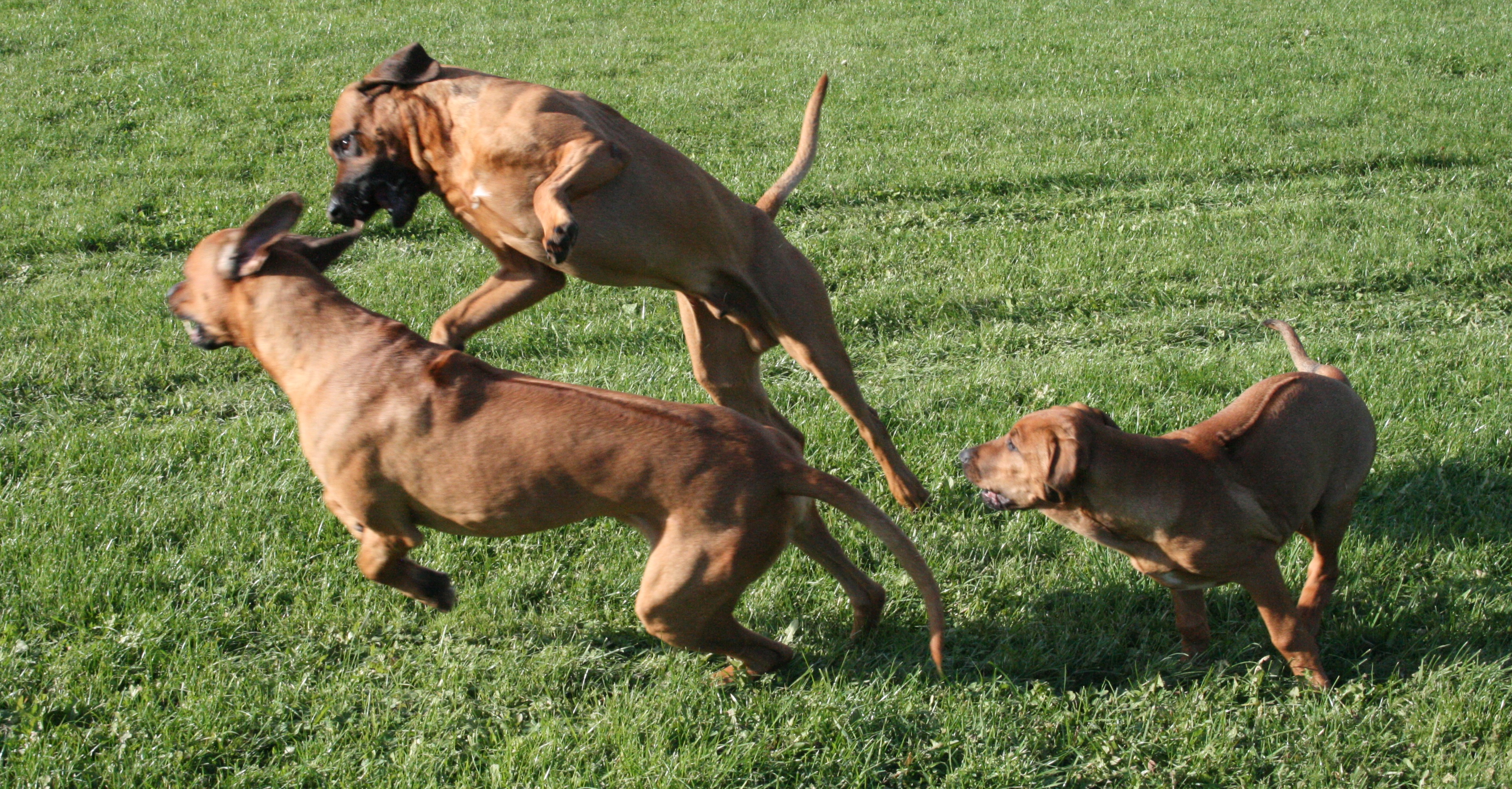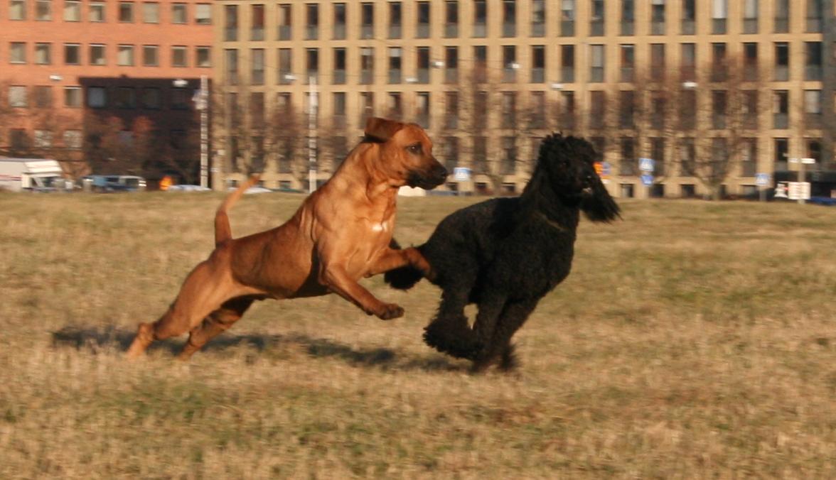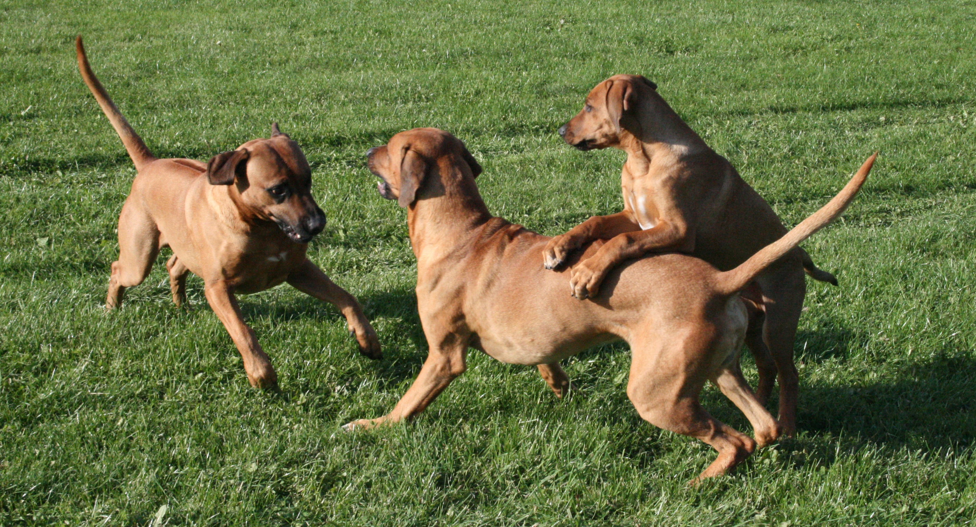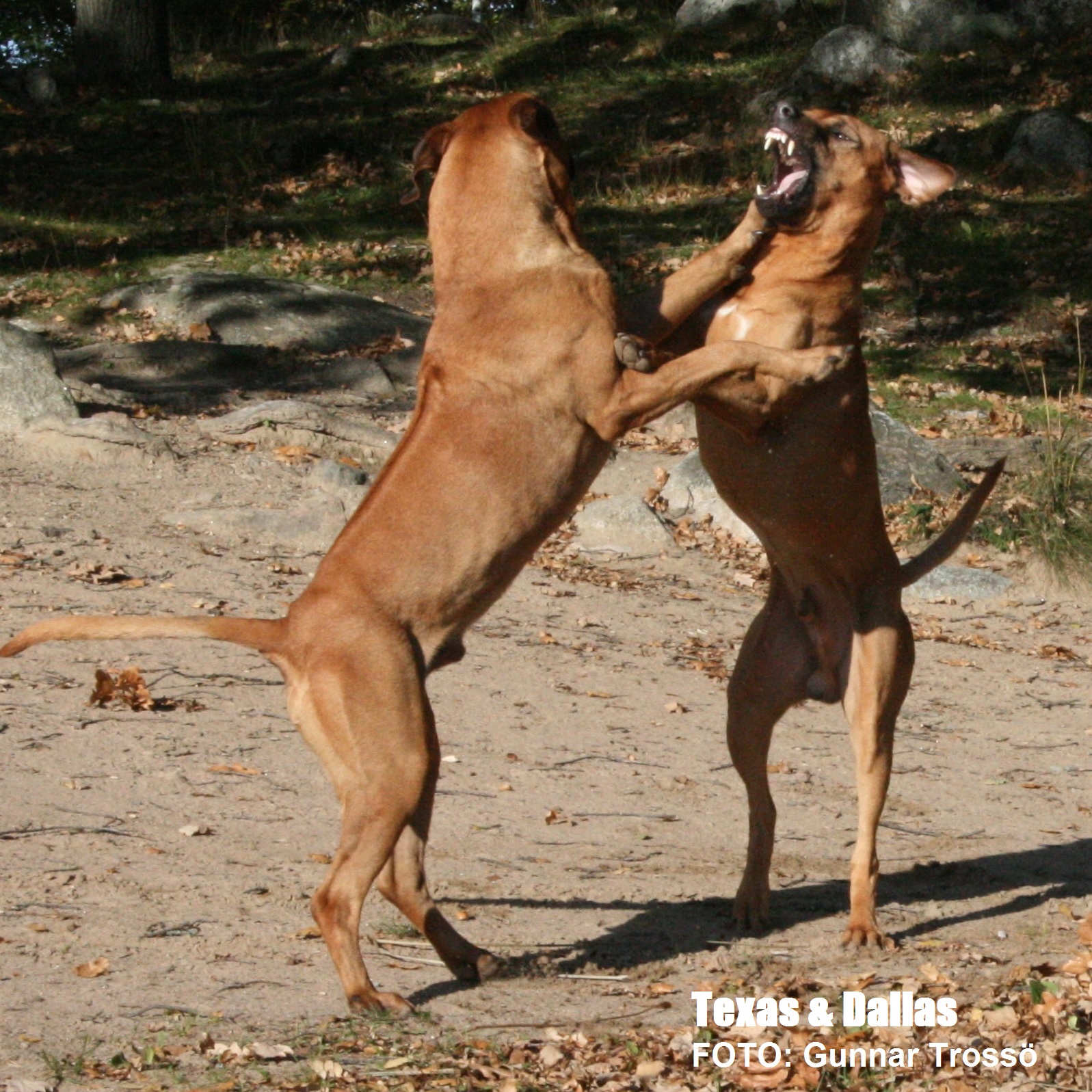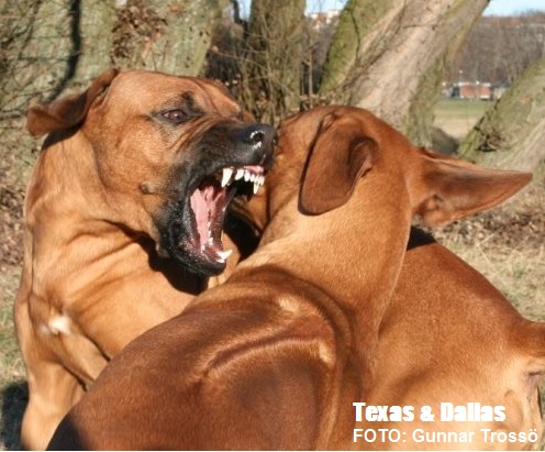 Leken kan förefalla dramatisk men är kontrollerad och bygger på fullständig tillit utan prestige. Två okastrerande vuxna hanhundar respekterar normalt varandra, men finner sällan intresse att leka. Samspelet mellan Texas och Dallas vill jag framhålla som synnerligen speciellt. Positionerna är fastställada och helt utan spänningar trots att Dallas i övrigt är mycket skarp. Det är för övrigt lika ofta pappa Texas som tar inititiv till att leka. Fördelen med Rhodesian Ridgeback i kampmomenten är att rasen agerar interaktivt och inte hamnar i låsta lägen. Leken omfattar naturliga tempväxlingar där hundarna stannar upp, innan nästa runda startar. Sista bilden i ovanstående bildserie visar hur det tempoväxlar från kamp till pusskalas.